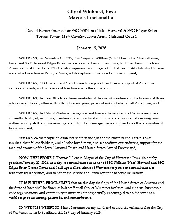 Mayor Tom Leners officially declared Thursday, January 22, 2026 as a Day of Remembrance in honor of SSG William (Nate) Howard and SSG Edgar Brian Torres-Tovar.  On December 13, 2025, these brave soldiers of the Army National Guard's 1-113th Cavalry Regiment, 2nd Brigade Combat Team, 34th Infantry Division were killed in action in Palmyra, Syria, while deployed in service to our nation.